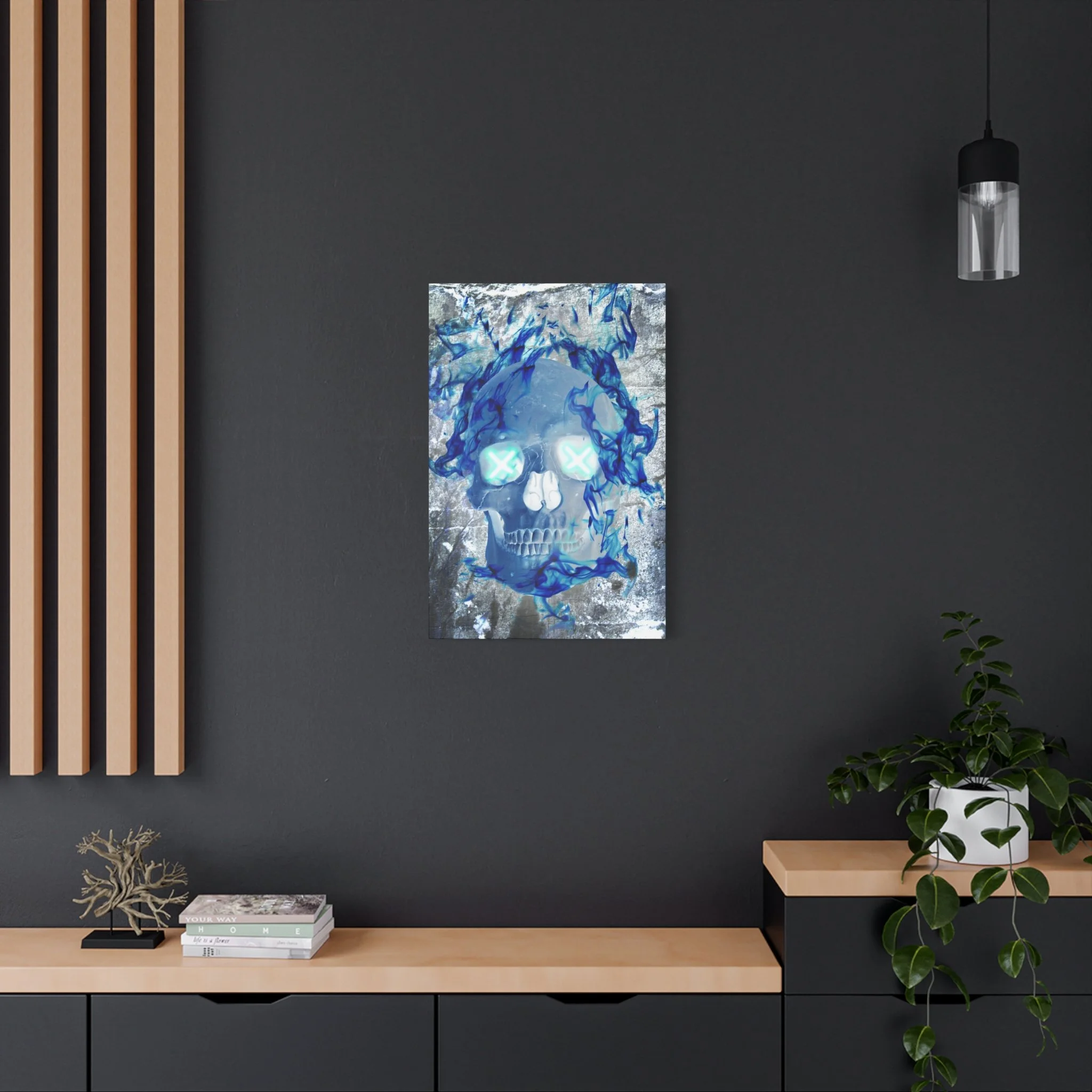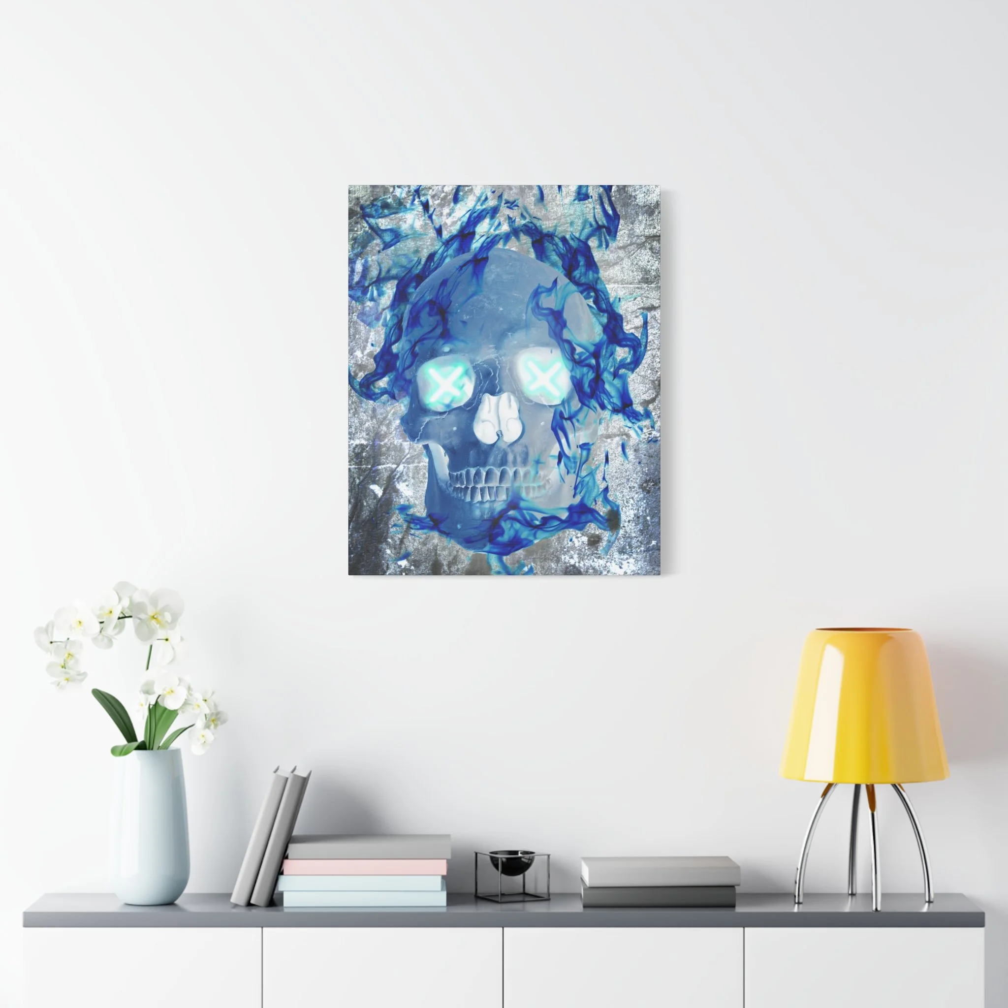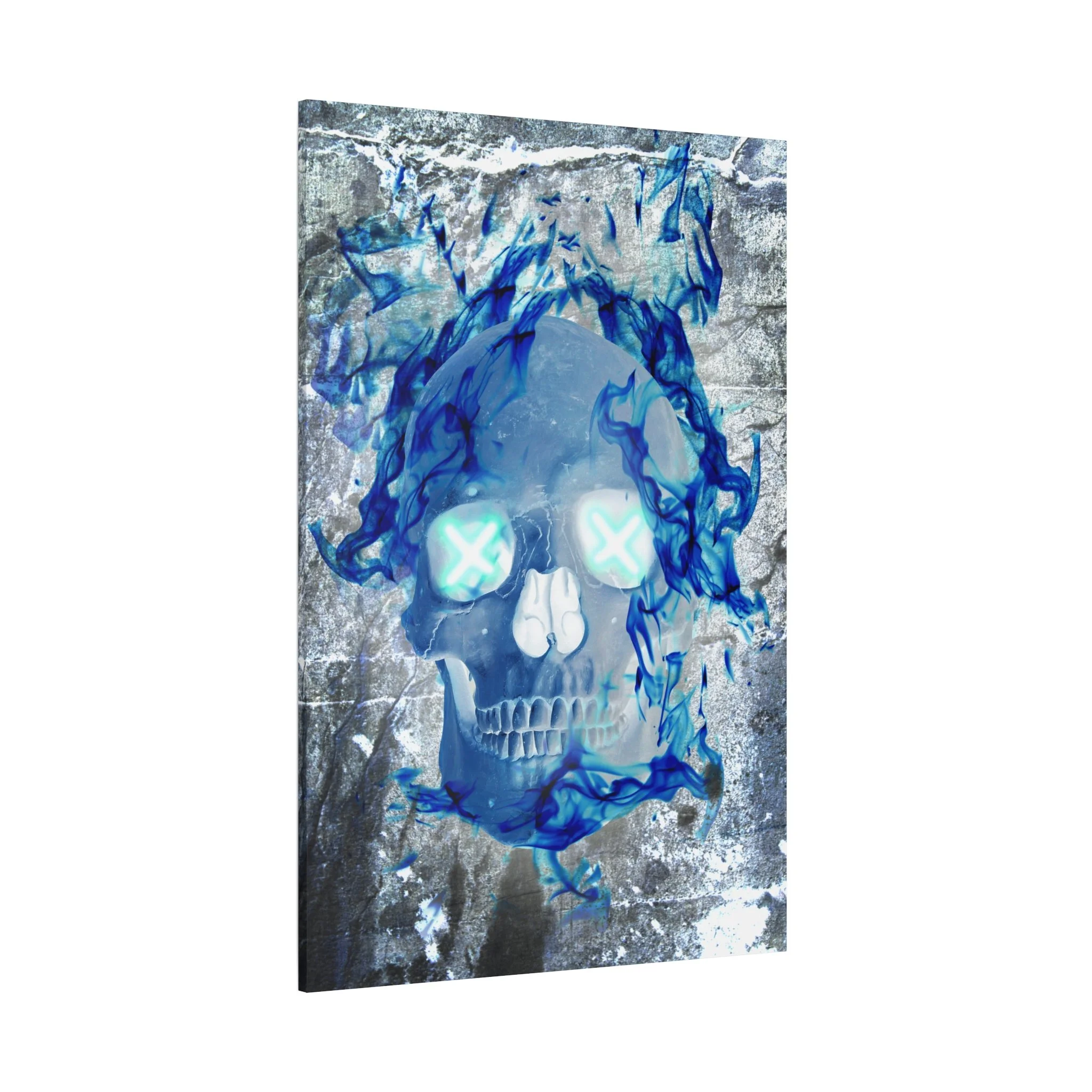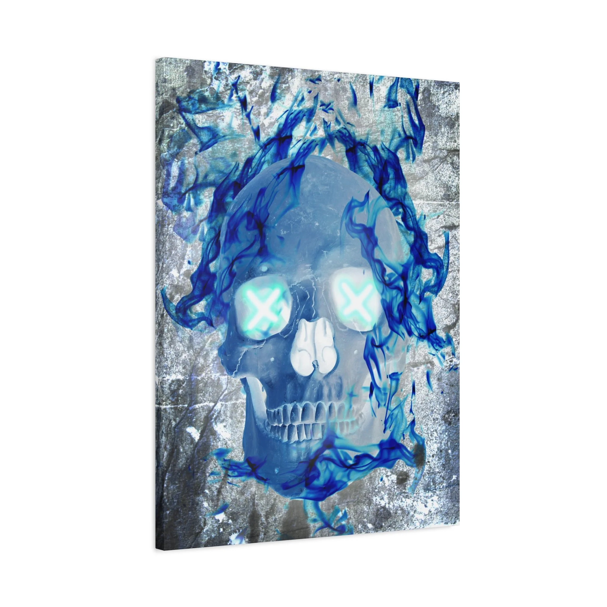 Blue Flame Skull Gothic Canvas Wall Art - Edgy Fire Skeleton Decor for Biker or Rocker Style